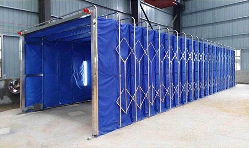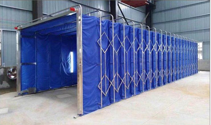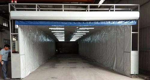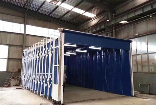 在伸移动折叠喷漆房的起点与终点均设有一个限位开关挡块,当前室打开时,一个限位开关接触到挡块后减速机自动停止,若一个限位开关失灵那么二个限位开关继续起作用,因此起到双重保护作用;当前室合拢时也同样采用双重限位开关,确保果酱视频色版前室性。