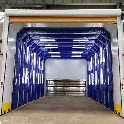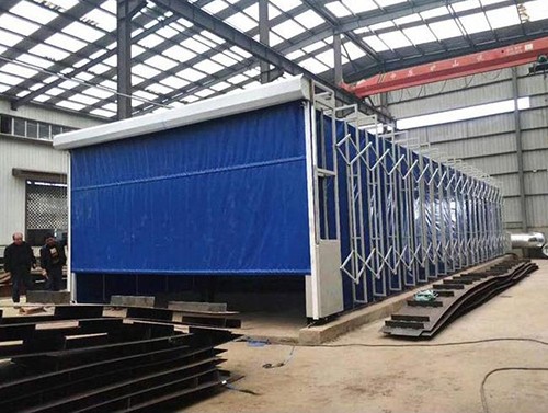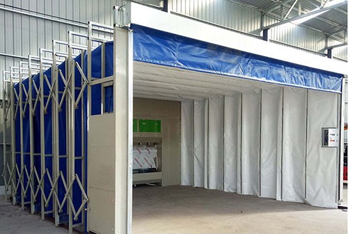移动果酱视频色版喷漆房为钢制框架结构,可前后果酱视频色版移动。框架之间的滑动连接机构保证框架在驱动装置的带动下沿地面的轨道前后竖直平行移动,同时带动蓬布展开合拢。移动前室收缩合拢时,将工件移入工作区,展开时可进行工件的喷漆或打磨工作。在不喷漆的工作时间内,可将前室合拢,腾出空间场地作为其他与喷漆交叉作业的工序使用。