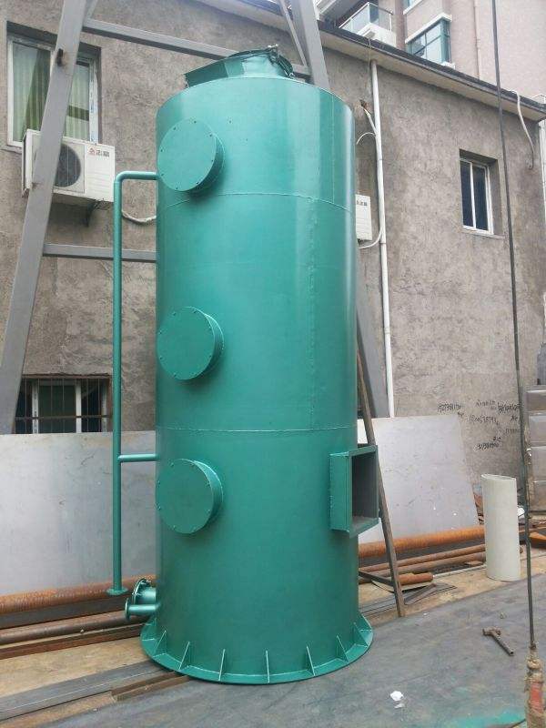 喷淋塔的工作原理就是:酸性气体从塔体下方进气口沿切向进入净化塔,在通风机的动力作用下,迅速充满进气段空间,然后均匀地通过均流段上升到一层填料吸收段。在填料的表面上,气相中酸性物质与液相中碱性物质发生化学反应。反应生成物油(多数为可溶性盐类)随吸收液流入下部贮液槽。未全吸收的酸性气体继续上 升进入一层喷淋段。在喷淋段中吸收液从均布的喷嘴高速喷出,形成无数细小雾滴与气体充分混合、接触、继续发生化学反应。然后酸性气体上升到二层填料段、喷淋段 进行与一层类似的吸收过程。二层与一层喷嘴密度不同,喷液压力不同,吸收酸性气体浓度范围也有所不同。在喷淋段及填料段两相接触的过程也是材热与传质的过程。 通过控制空塔流速与滞贮时间确保这一过程的充分与稳固。对于某些化学活泼性较差 的酸性气体,尚需在吸收液中加入一些喷淋塔除臭剂。塔体的上部是除雾段,气体中所夹带的吸收液雾滴在这里被去除下来,经过处理后的洁净空气从净化塔上端排气管放入大气。