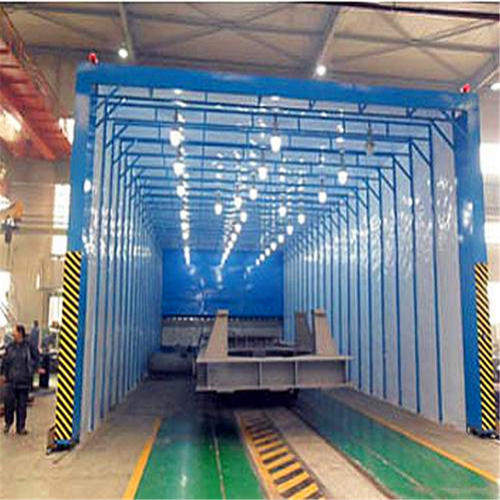 移动果酱视频色版喷漆房为钢制框架结构,可前后果酱视频色版移动。框架之间的滑动连接机构保证框架在驱动装置的带动下沿地面的轨道前后竖直平行移动,同时带动蓬布展开合拢。移动前室收缩合拢时,将工件移入工作区,展开时可进行工件的喷漆或打磨工作。在不喷漆的工作时间内,可将前室合拢,腾出空间场地作为其他与喷漆交叉作业的工序使用。