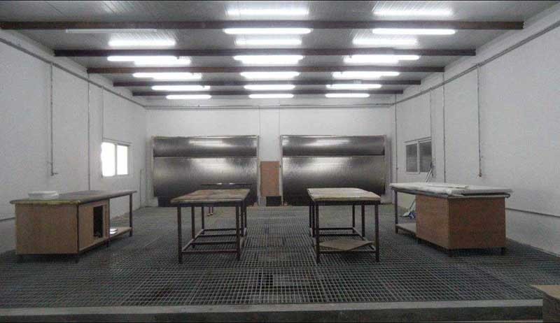 喷漆时,外部空气经过初级过滤网过滤后由风机送到房顶,再经过顶部过滤网二次过滤净化后进入房内。房内空气采用全降式,以0.2-0.3m/s的速度向下流动,使喷漆后的漆雾微粒不能在空气中停留,而直接通过底部出风口被排出房外。这样不断地循环转换,使喷漆时房内空气清洁度达98%以上,且送入的空气具有一定的压力,可在家具的四周形成一恒定的气流以去除过量的油漆,从而大限度地保证喷漆的质量。